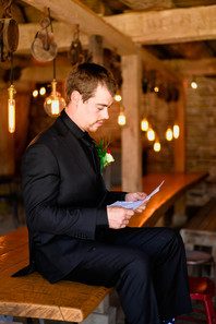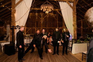 While I was hanging out with Tracie, my awesome second shooter Beth Ann was down by the barn with Tyler and his groomsmen. This space was SO cool and absolutely perfect for groomsmen to get ready in! The rustic look & string lights created a fun space for the guys to hang out in before getting dressed in allllll black (which looked incredible!) The guys had a blast taking photos together before it was time for Tracie & Tyler to share their first look.